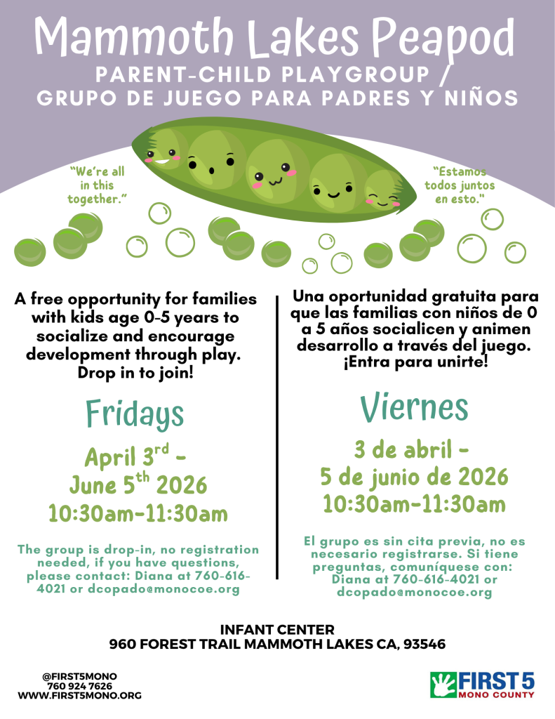 Join us for our Mammoth Lakes Parent/Child Peapod Playgroup! New session beginning April 3rd, every Friday, until June 5th, 2026 at the Mammoth Lakes Infant Center (960 Forest Trail) from 10:30am-11:30am. A free opportunity to encourage playtime and socialization for you and your child with other community parents! Drop in to join Playgroup Leader, Diana – no sign up required! Click here for the flyer